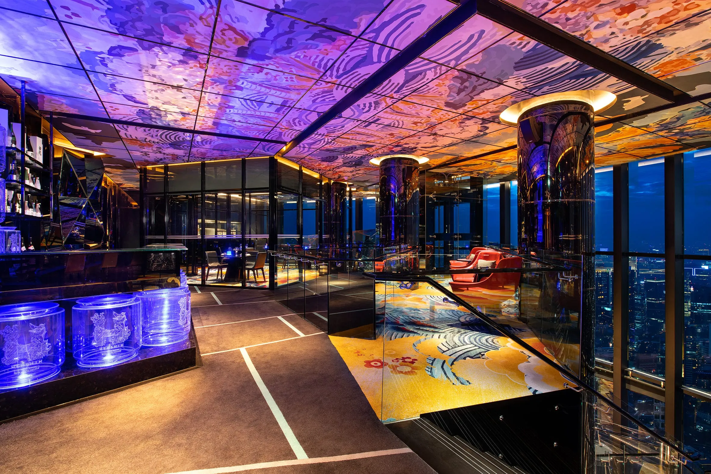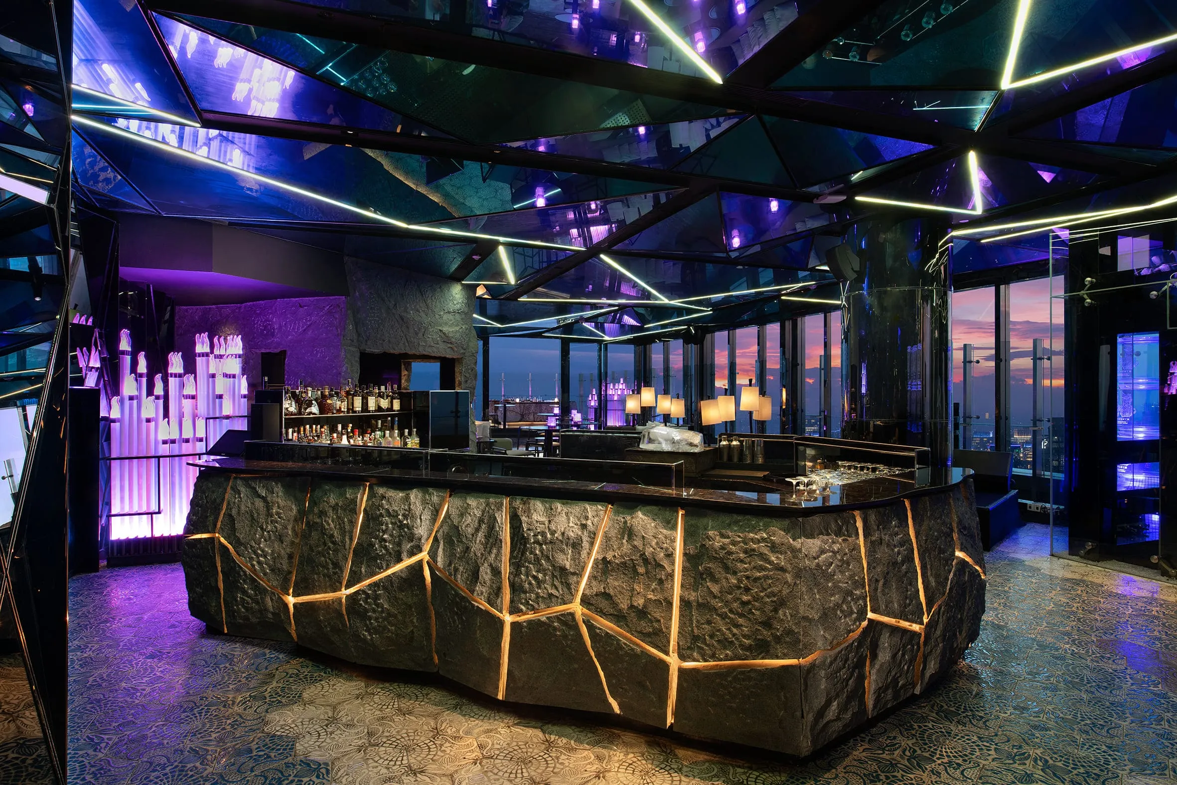 Perched above the skyline, the space blends warm contemporary design with panoramic floor-to-ceiling windows and an open-air terrace that reveals Jakarta’s glittering cityscape in every direction. The atmosphere shifts with the evening: lively and vibrant at sunset, effortlessly sophisticated as night falls.