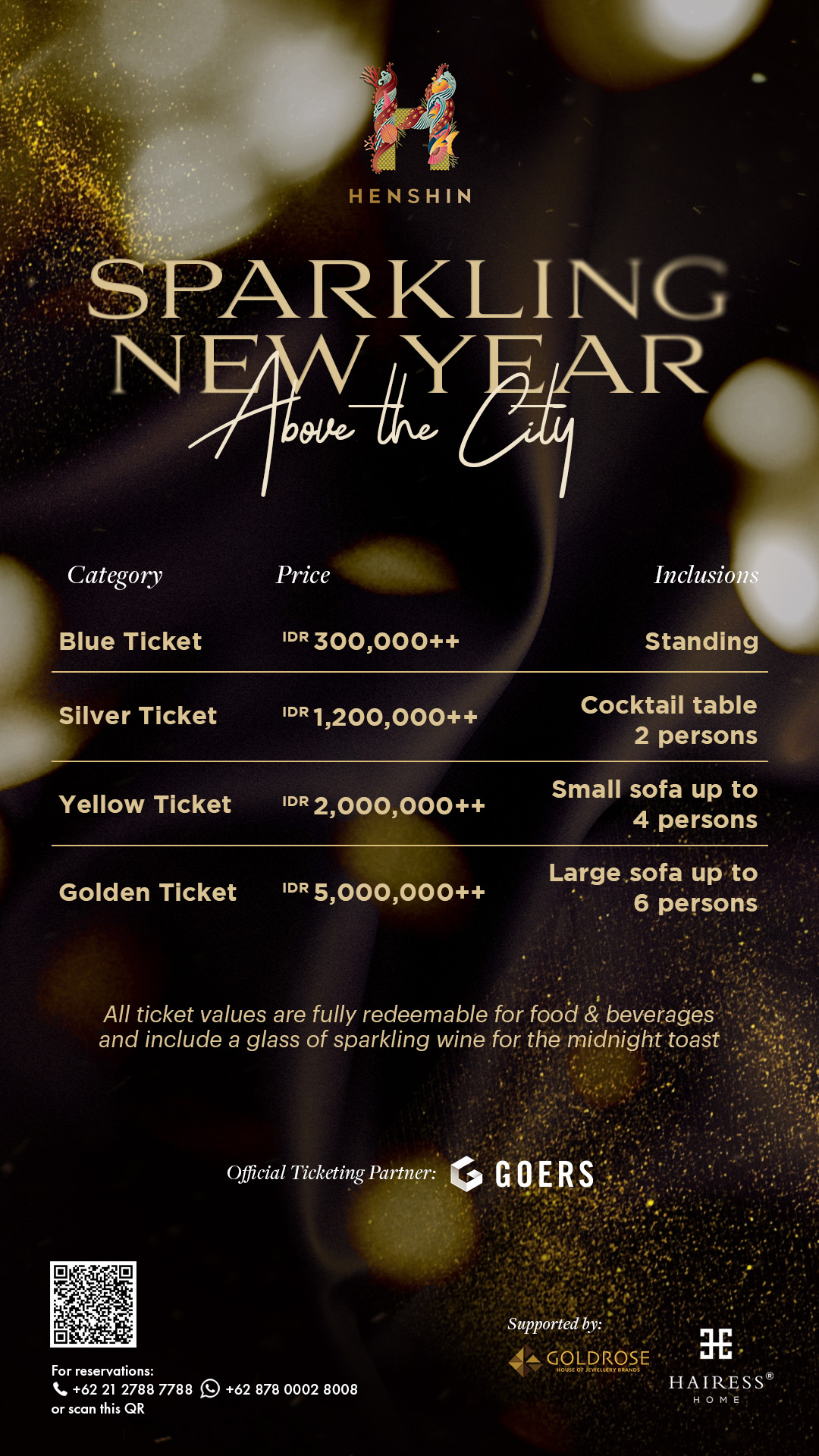 All ticket values are fully redeemable for food and beverages and include a complimentary glass of sparkling wine for the midnight toast.