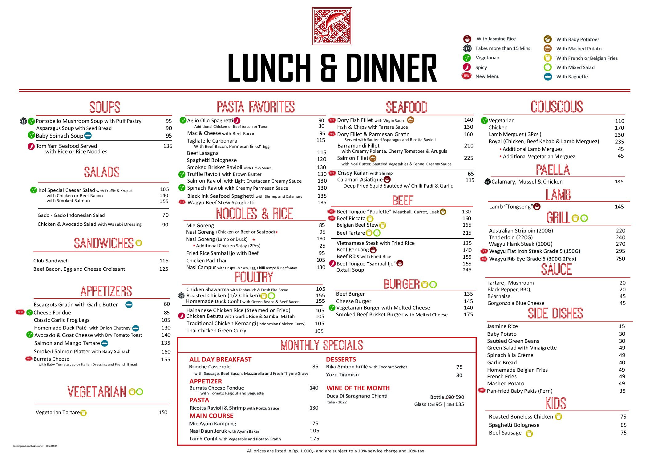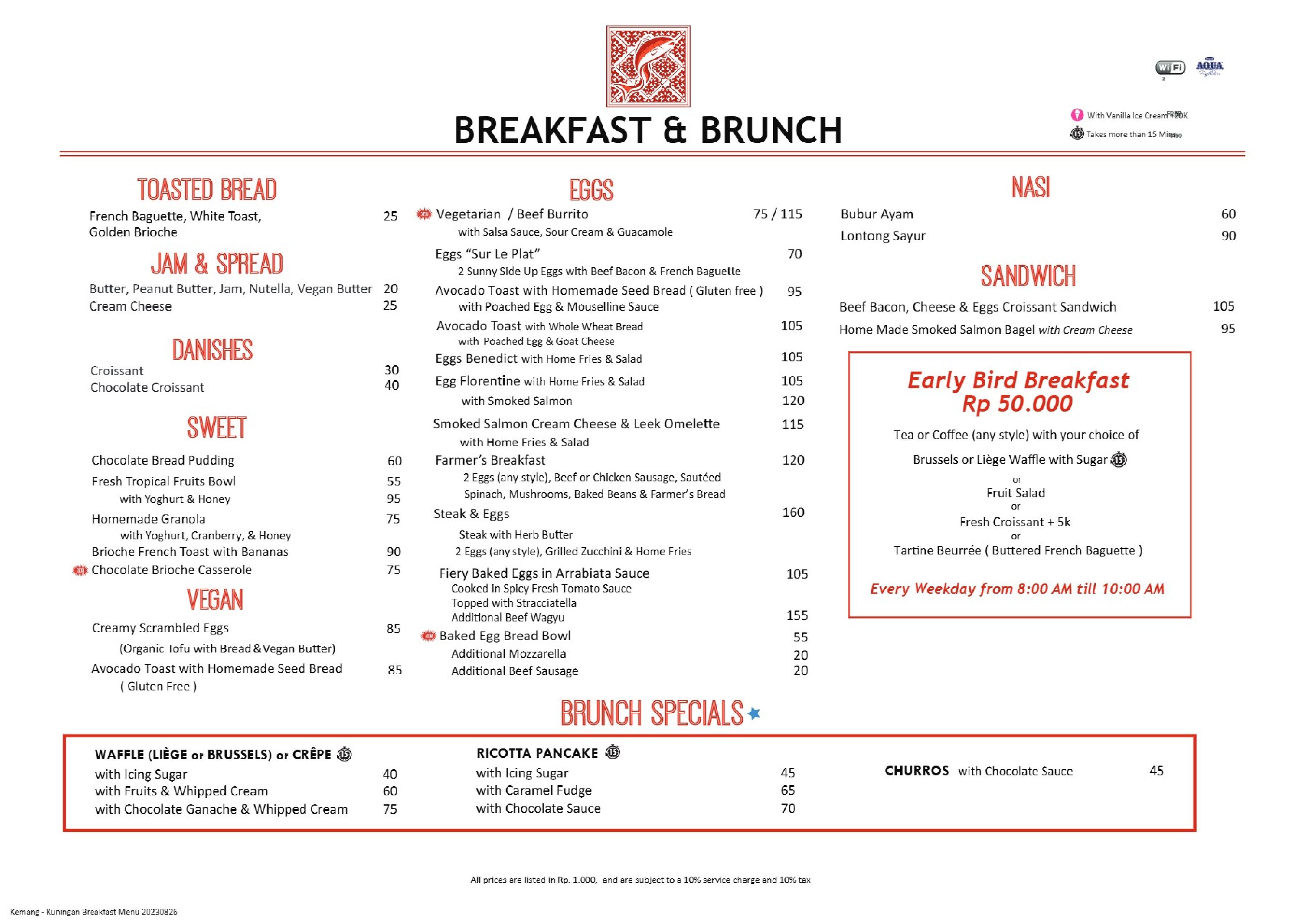 KOI terletak pada variasi menunya yang lintas selera serta program andalannya, All You Can Eat Weekend Brunch yang rutin menjadi magnet utama setiap Sabtu dan Minggu. Menu khas seperti Nasi Goreng dengan pilihan lamb, Chicken Pad Thai, hingga Tom Yum Soup berpadu dengan comfort food ala Barat seperti Ravioli, Roasted Chicken, Salmon, hingga dessert klasik Apple Crumble. Kehadiran bar yang menyajikan wine, beer dan cocktails semakin memperkuat posisinya sebagai bistro serba lengkap yang bisa memenuhi banyak momen sekaligus.