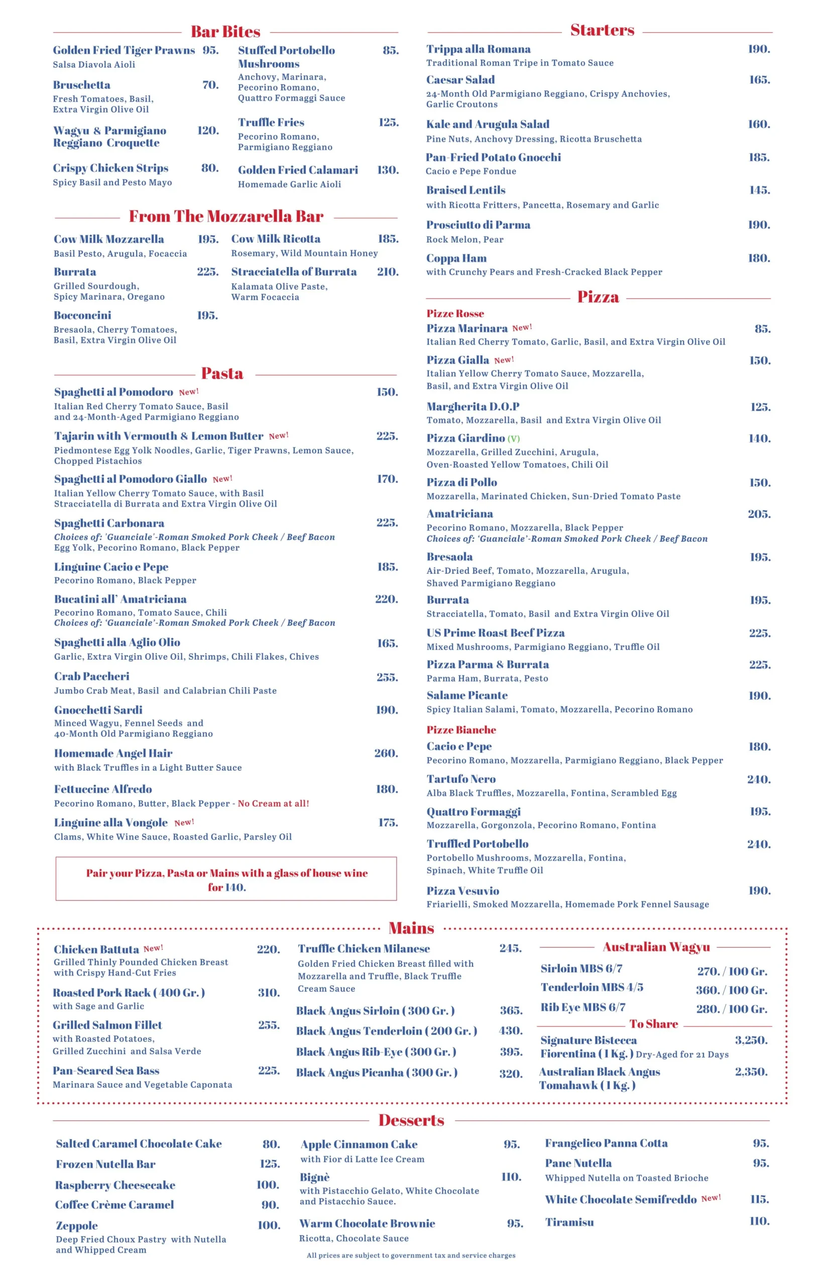 Pasta klasik lainnya seperti Spaghetti Carbonara, Bucatini all’Amatriciana dan Cacio e Pepe diperkaya penggunaan bahan premium seperti Parmigiano Reggiano dan guanciale asli Italia. Bar bites seperti Wagyu & Parmigiano Croquette serta pilihan wine dan cocktail seperti Garibaldi dan Negroni sempurna melengkapi pengalaman bersantap.